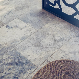 Carrelage en travertin Silver, finition vieillie, Opus Romain x 1,2 cm.